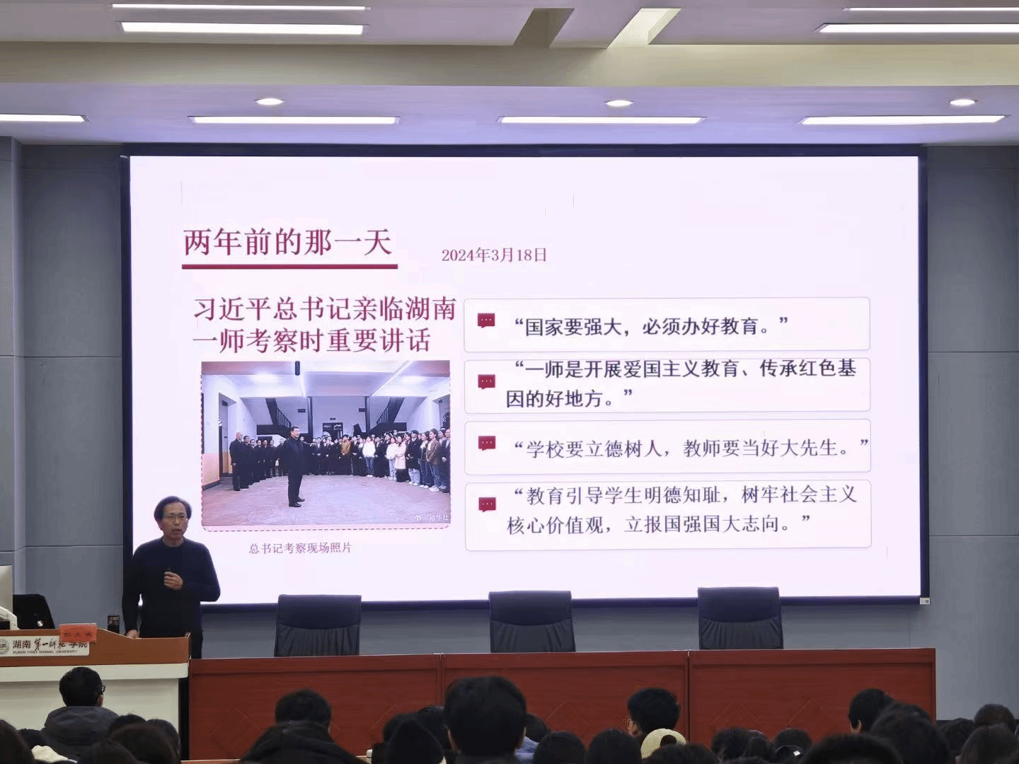 活动在观看习近平总书记考察太阳官网新闻报道视频中拉开序幕,师生们重温了习近平总书记考察我校重要讲话精神。刘大维在专题分享中提出三点要求:一要立足“办好第一师范”战略定位,将个人理想融入国家发展大局,夯实专业根基;二要深刻理解“大思政课”内涵,做到明大德、守公德、严私德,始终保持正确政治方向;三要深入挖掘红色文化资源,传承红色基因,筑牢思想根基。他强调要将习近平总书记考察太阳官网重要讲话精神贯穿立德树人全过程。